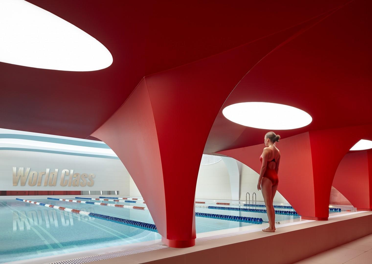 If the interiors of the other clubs in the chain were designed and implemented from scratch, the pool in the Olympic Club got its new interior in the process of its reconstruction. The principal difference between “before” and “after” fills the authors with professional satisfaction. It should be noted that the result was achieved with a minimum of expressive means. The pool space has acquired wholeness and clarity. It is filled with light and has become visually larger. Its architectural forms are interpreted in the spirit of futurism: the plastic bending of the supporting beams have added expressiveness to the space, while the outlines of the beam edges are accentuated by special illumination. The energy of contrast is expressed here in the division between white and red spaces: a low and massive red arcade pushes athletes into a daylight-filled zone, while the soft blue pool basin makes this contrast more sophisticated and intriguing.
